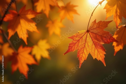 Golden and russet maple leaves, backlit by sunlight, showing intricate detail , october, macro
