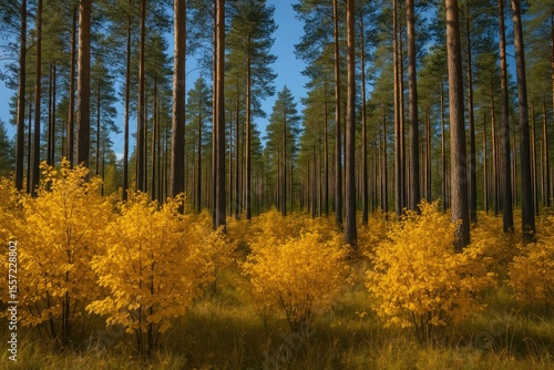 Golden autumn foliage backdrop in a coniferous woodland