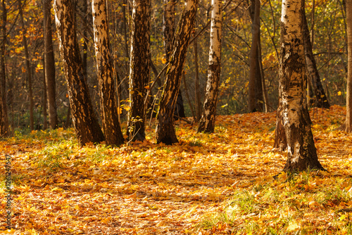 Golden autumn leaves blanket a serene forest with birch trees shining in the warm afternoon light