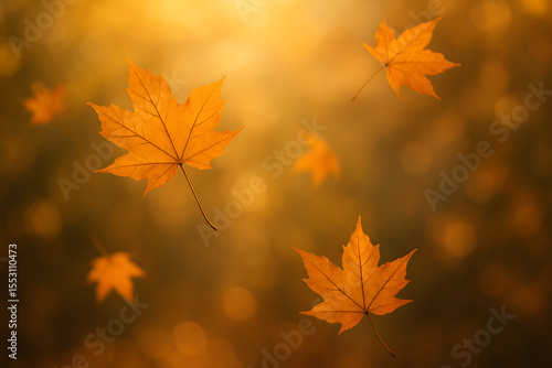 Golden autumn maple leaves floating in warm sunlight, dreamy seasonal nature background
