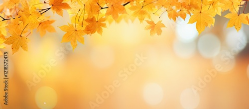 Golden autumn maple leaves gently falling against a soft blurred warm orange background with ample copy space for text or designs.