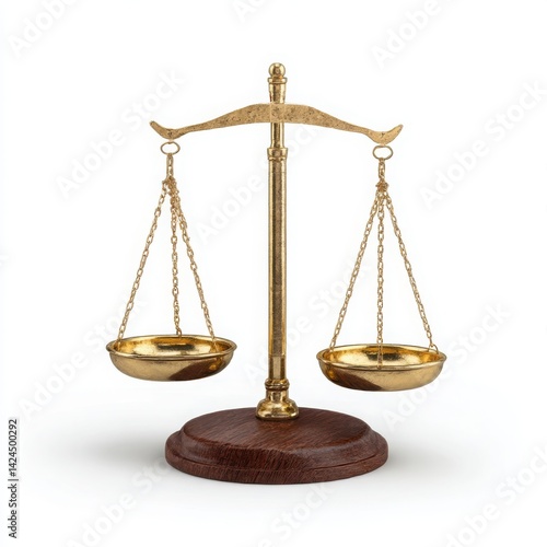 Golden balance scales on wooden base on white background