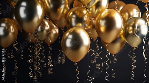 Golden balloons on a black background. AI