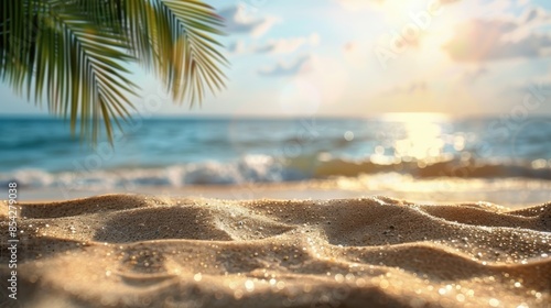Golden beach sand sparkles under the sun with a palm leaf framing the scene, ocean waves in the background.