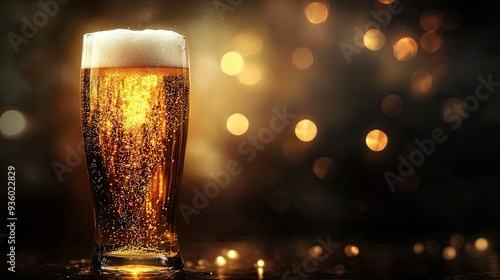 Golden beer in a tall glass, illuminated by warm, soft light, with a rich frothy head glistening invitingly. -