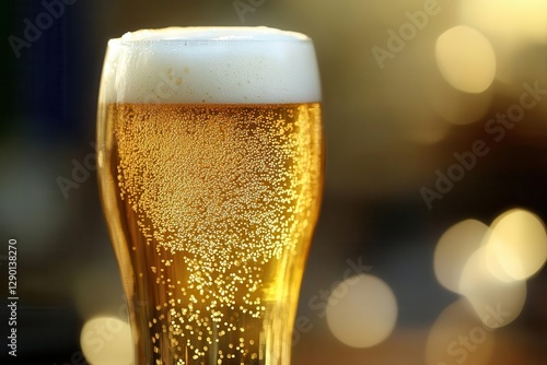 golden beer with frothy head sparkles in a tall glass, bubbles rise against a crisp white cutout, soft sunlight glows, refreshing simplicity shines.