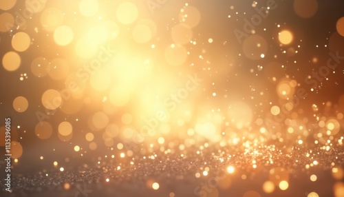 Golden bokeh lights create festive, sparkling background. Shimmering particles, glowing lights create effect of stardust confetti. Abstract design evokes sense of luxury, celebration. Perfect for
