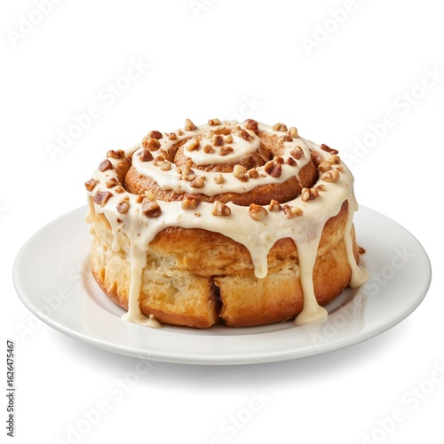 Golden brown cinnamon bun with light cream frosting. Central on white plate. Slightly tilted plate. Single object. Simple composition. Blurred background.