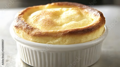 Golden Brown Creamy Sweet Souffle Dessert in White Ramekin