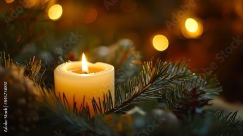 Golden candle with glitter on a pine branch in front of a golden glittering background. Concept of Christmas, holidays, festive decoration, celebration. Copy space