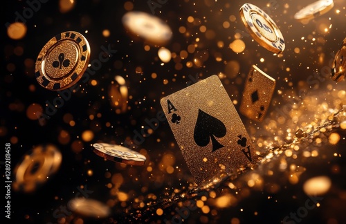 Golden Casino Chips and Cards Floating in a Vibrant Sparkling Scene