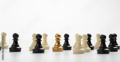 Golden Chess pawn standing to Be around of other chess, Concept of a leader must have courage and challenge in the competition, leadership and business vision for a win in business games