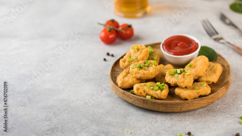 Golden chicken nuggets in wooden plate, sprinkled with green onions and a lemon wedge. Pub menu. Copy space