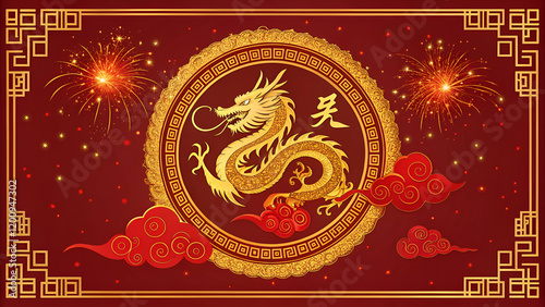 Golden Chinese dragon swirling in the center with fiery sparks, framed by ornate red clouds and traditional gold borders