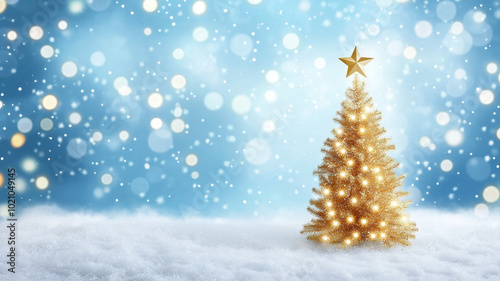 Golden Christmas tree in the snow on a shiny blue background with copy space