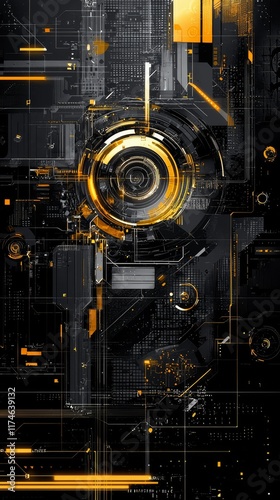 Golden Circuitry Abstract: A mesmerizing display of intricate golden circuitry interwoven with digital designs and metallic structures.