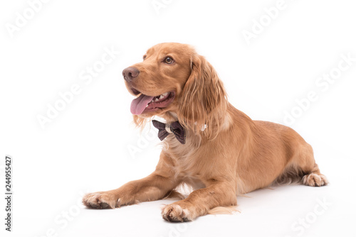 Golden cocker spaniel dog wearing a bow tie having a photo shoot isolated on white background
