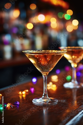 Golden cocktail on bar top with bokeh lights creating a festive mood for celebration and nightlife with a shallow depth of field and warm tones