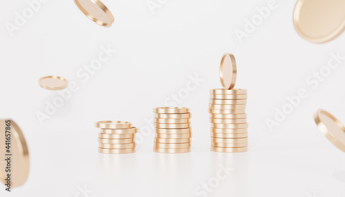 Golden coin stacks growing graph on white background, business investment and saving money concept, realistic 3d render