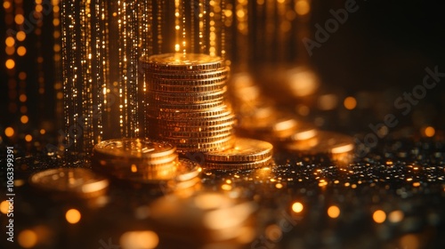 Golden coins are arranged in stacks amidst a backdrop of sparkling particles, creating an enchanting, luxurious scene in low light.