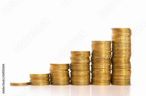 golden coins stack growth with white background. money saving. business investment successful growing and financial and banking concept.
