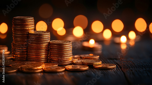 Golden Coins Stacked in Ascending Order with Bokeh Lights in Background