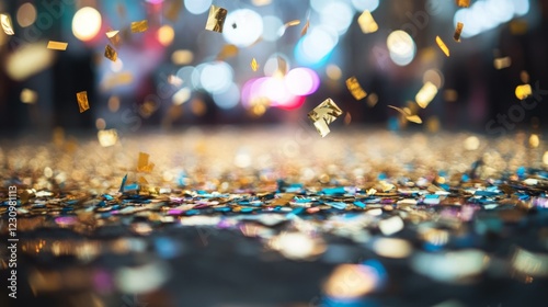 Golden confetti falls, celebrating a joyous occasion. Sparkling lights create a festive atmosphere.