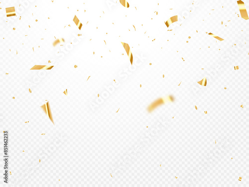 Golden confetti graphic design. Falling shiny confetti isolated on transparent background.