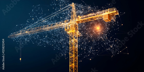 Golden Construction Crane, Networked & Illuminated, Reaching for Progress, Advancing Infrastructure Development Significantly