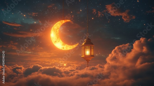 Golden crescent moon and lanterns hanging in the sky with clouds at night, with Ramadan Kareem illustration design background