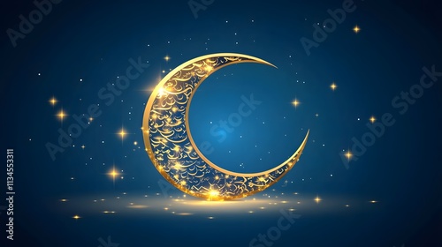 Golden crescent moon with intricate design on a dark blue background, surrounded by sparkling stars.