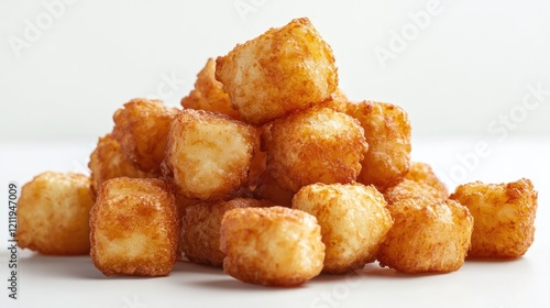 Golden crispy tater tots piled on a white background perfect for food advertisements and culinary presentations