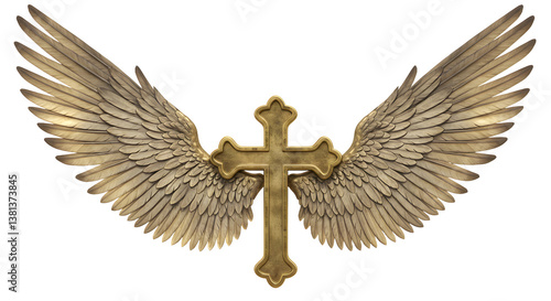 Golden Cross Ornament with Winged Design on Plain White Background