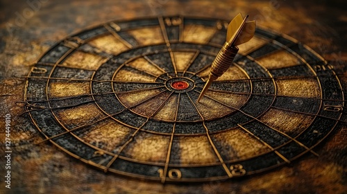 Golden Dart Striking Bullseye On Vintage Dartboard