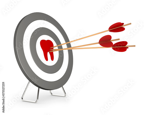 Golden dart successfully hitting the Teeth disease. Tooth with dartboard Isolated on white background 3d rendered illustration.