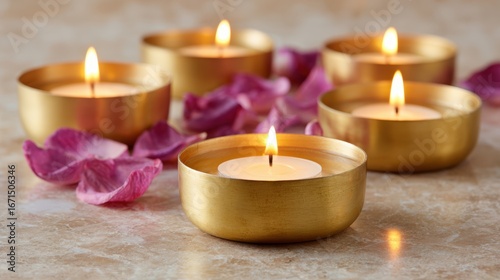 Golden decorative candles with soft flames surrounded by vibrant flower petals create a warm and inviting atmosphere for Diwali celebrations and festive occasions