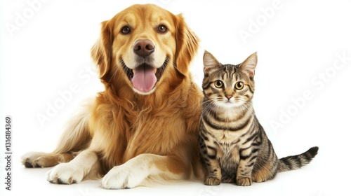 Golden dog and striped cat, both sitting, white background emphasizes their features
