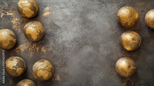 Golden Earth globes artistically arranged on a textured grey backdrop, symbolizing the celebration of Earth Day and the planet's beauty.