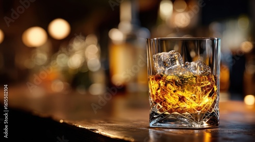 Golden Elixir: A close-up shot of a chilled glass of amber-hued whiskey, with crystal-clear ice cubes, perfectly positioned on a dimly lit bar, offering a sense of sophistication.