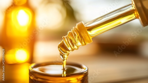 Golden Essential Oil Being Poured from a Glass Dropper into a Jar : Generative AI