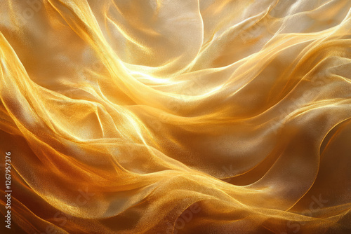 Golden fabric draped in soft waves, illuminated by warm light, creating a luxurious and elegant texture.