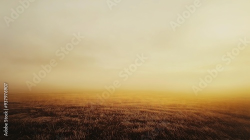 Golden field under a misty sky at dawn with warm light casting over the landscape
