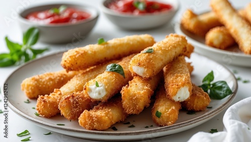 Golden fried mozzarella sticks with fresh basil and marinara sauce
