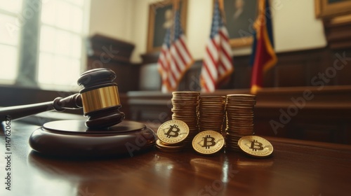 Golden Gavel on Bitcoin Coins in Courtroom Setting