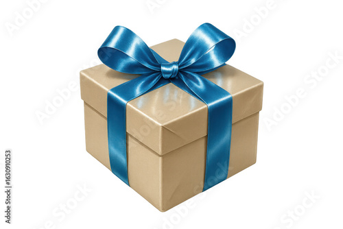 Golden gift box, blue ribbon adorning surface, highlighting festive packaging against clean transparent backdrop