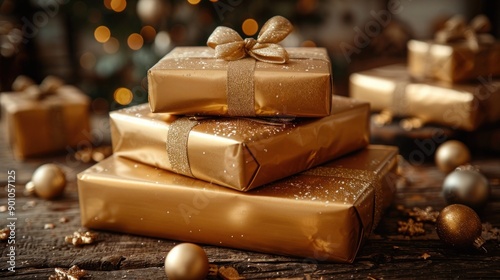 Golden Gift Boxes on Wooden Table for Birthday or Christmas Celebration