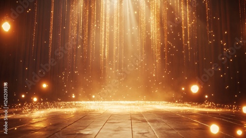 Golden Glittering Lights Festive Background Magical Abstract Sparkling Shimmering Elegant Luxury Design Premium Wood Floor Stage Presentation Template