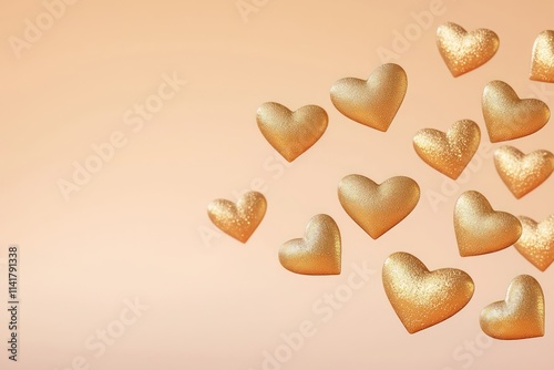 Golden hearts float delicately on a subtle peach background, creating a minimalist scene.