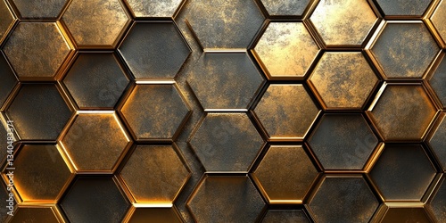 Golden hexagonal patterns create a modern design showcasing geometric beauty and elegance in a polished surface