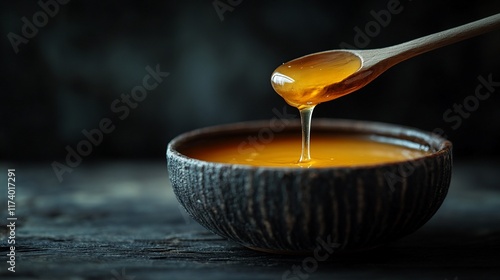 Golden honey dripping from wooden spoon into bowl. (1)